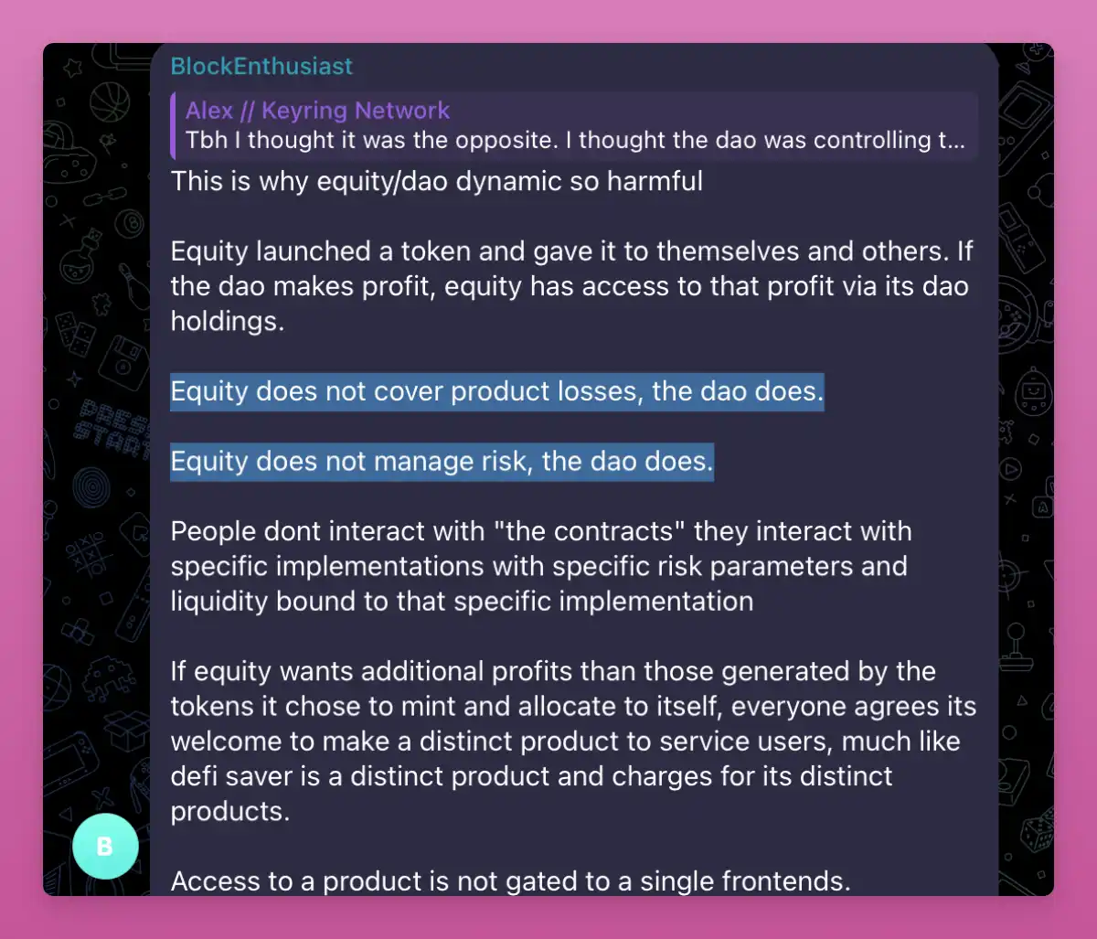 這就是為什麼股權/ DAO 動態會造成傷害(這是我從TG 群聊中發現的)。