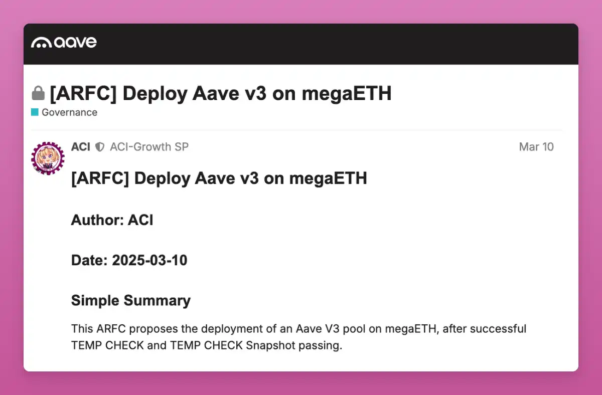 Aave DAO 與多個服務提供者合作,尤其是ACI,早在3 月就已提議在MegaETH 上部署。相關討論仍在進行中。