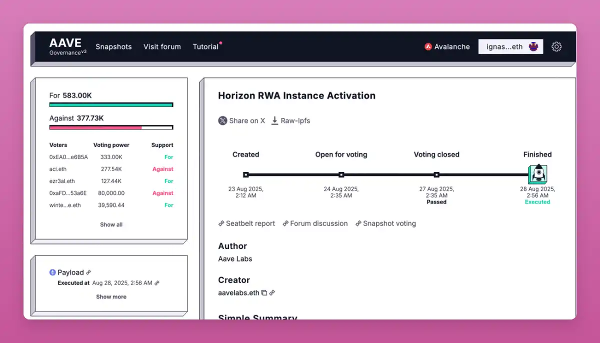 儘管有許多擔憂(其中一項明確指出Aave Labs 與DAO 的明確職責),Horizon 仍上線了。這是最具爭議的一次投票獲勝。