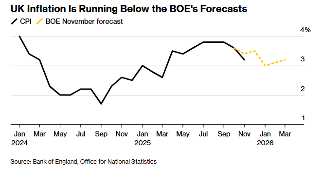 英国央行可能还会强调,通胀运行低于预期水平。11月英国CPI同比增幅冷却至3.2%,而英国央行上个月才预测为3.4%。