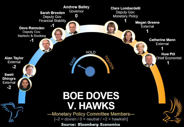 投票分歧在11月,贝利站在了鹰派阵营一边,该阵营包括副行长伦巴德利和首席经济学家皮尔。贝利当时表示,在政府预算案即将出台之际,他需要看到更多通胀下降的证据,才能支持进一步放松政策。