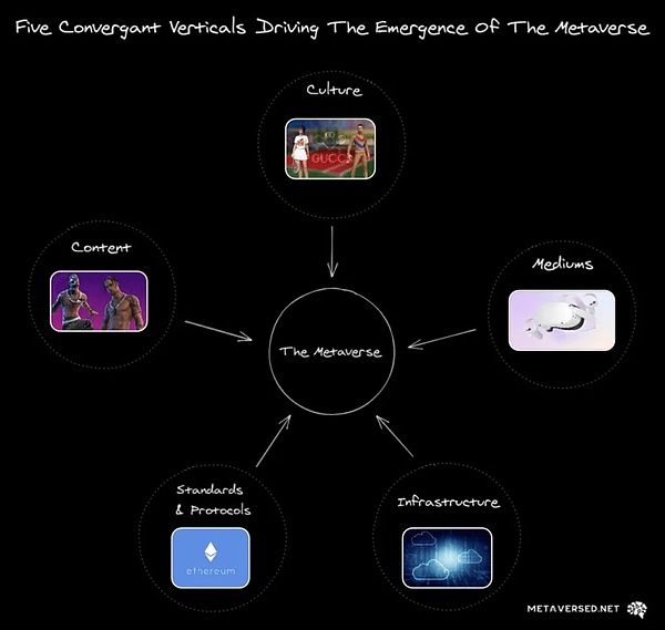 据估计,虚拟商品市场的规模约为500亿美元,预计到2025年将增长到1900亿美元,且有相当发生在相对模糊的二级市场,所以这个数字可能更高,蕴含巨大蓝海潜力的价值洼地无不让行业为之垂涎,这也令元宇宙风口来势汹汹,不可阻挡,尽管如此,在某种程度上元宇宙现在不太可能真正为人所知,即便体验过VR、AR的人也略知皮毛,在Piers Kicks的论文《进入虚空:当加密技术遇到元宇宙》里,他总结出元宇宙具有“强社交、鲜活同步、大幅规模化、持续存在、不挑硬件、高度可互操、经济丰富、桥接不同世界、内容丰富几大属性,并指出组成元宇宙五个关键部分有内容、标准协议、基础设施、媒介、文化。最终的指向是区块链加密技术将成为元宇宙不可或缺的一部分,并且将为游戏和娱乐行业带来全新的商业模式与机会。