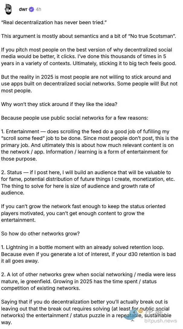這並非傲慢,而是創業專案在生命週期後期常見的現實決斷。從這個意義上說,Farcaster 不是放棄了社交理想,而是放棄了對其規模化的幻想。