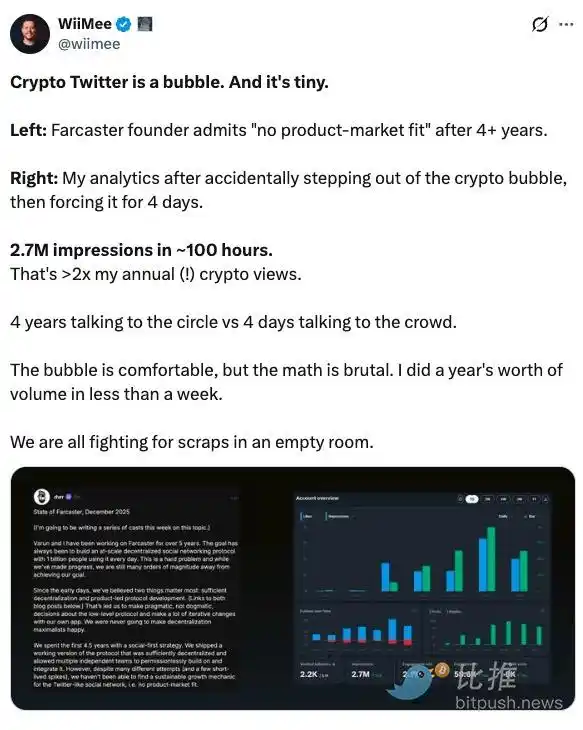 在一次「意外跳出加密內容圈層」後,Wiimee 連續四天面向泛人群創作內容,其分析數據顯示,在約100 小時內獲得了270 萬次曝光,超過他一年內全部加密內容瀏覽量的兩倍。
