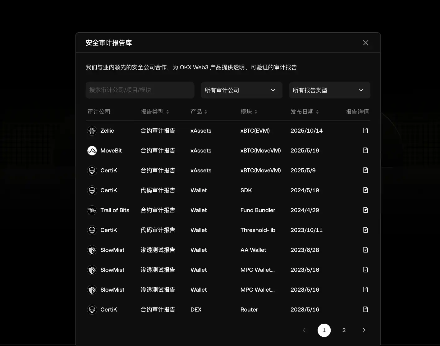 在皮夾業裡,審計長期存在一個現實問題:很多項目確實「做了審計」,但訊息分散在公告、PDF、社媒轉發裡,普通用戶很難快速搞清楚「誰審了、審了什麼、有沒有修、什麼時候更新」。 OKX 錢包這次更顯眼的動作,是把可公開的第三方審計報告集中到統一入口,並在頁面上直接標註“發佈於2022 年11 月11 日、更新於2025 年11 月17 日”,讓用戶一眼就能判斷這不是一次性陳列,而是持續維護的信息披露窗口。