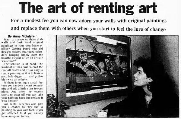 有时,人们想要租赁而非购买艺术品。这一现象在艺术界已经盛行了数十年。例如,现代艺术博物馆自 1957 年起就开始经营艺术品租赁业务。艺术家和收藏家有了新的收入来源,承租方则能以极低的价格短暂拥有某个艺术品。