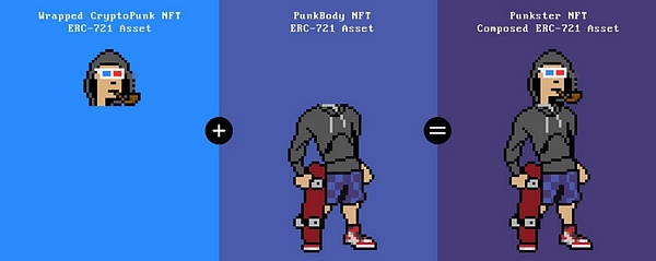 组合:我们可以将多个 NFT 组合在一起,或者将额外的实用性和价值附加到现有 NFT 上。AlchemyNFT 的AutographNFT 就属于后者,提供利用数字签名签署现有的 NFT 的功能。Punkbodies 则采用前者的思路,让用户可以将 Wrapped CryptoPunk(一个 ERC 721 代币)与 PunkBody(另一个 ERC 721 代币)组合起来,创建一个可以下载或铸造 Punkster(朋克小人)。铸造 Punkster NFT 会锁定原来的 ERC 721 代币,用户可以将这个 NFT 销毁,从而释放原来的 ERC 721 代币。组合型 NFT 继承了原有代币的来源和实用性,同时提供了额外的功能或实用性。
